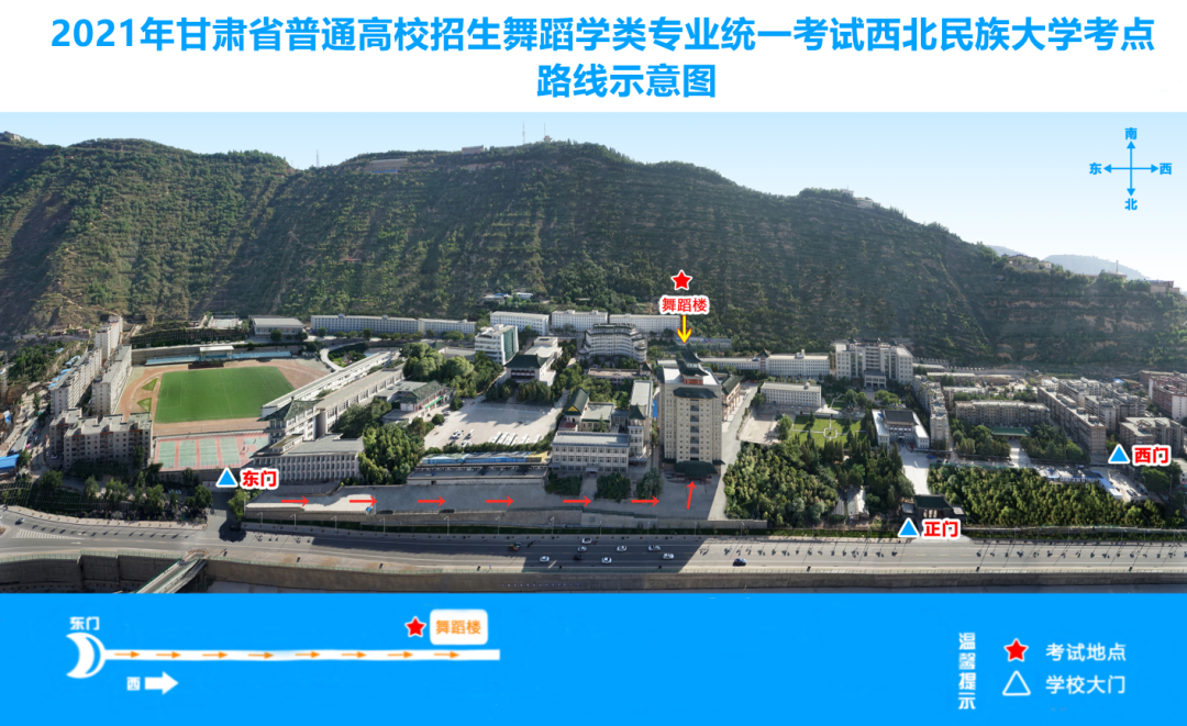 考生須于考試時間提前一小時,持身份證、報名登記表、省藝術類準考證、考試前一天健康出行碼、行程卡等證件,由西北民族大學西北新村校區(qū)東門,經(jīng)體溫檢查后由工作人員統(tǒng)一引導進入校園,前往舞蹈樓906、907室候考??荚噮^(qū)域?qū)嵭虚]環(huán)管理,考生不得從其他校門進出。