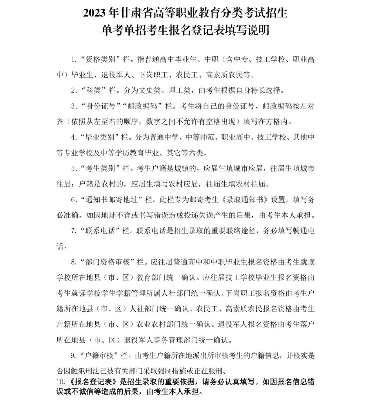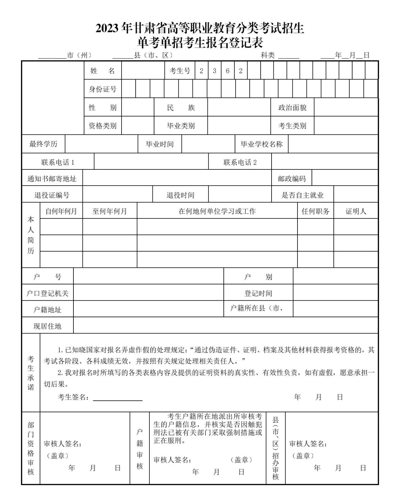 考生報名并提交后,打印《2023年甘肅省高等職業(yè)教育分類考試招生單考單招考生報名登記表》(見附件),一式三份。
