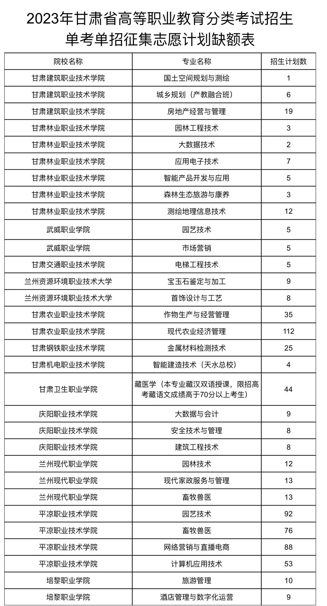 附件:2023年甘肅省高等職業(yè)教育分類考試招生單考單招征集志愿計(jì)劃缺額表