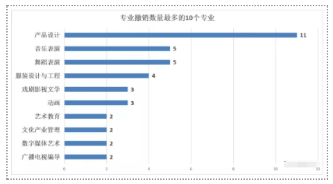 據(jù)統(tǒng)計(jì),11個(gè)高校取消產(chǎn)品設(shè)計(jì)專業(yè),各有5個(gè)高校取消音樂表演和舞蹈表演專業(yè)設(shè)置,具體情況如下圖: