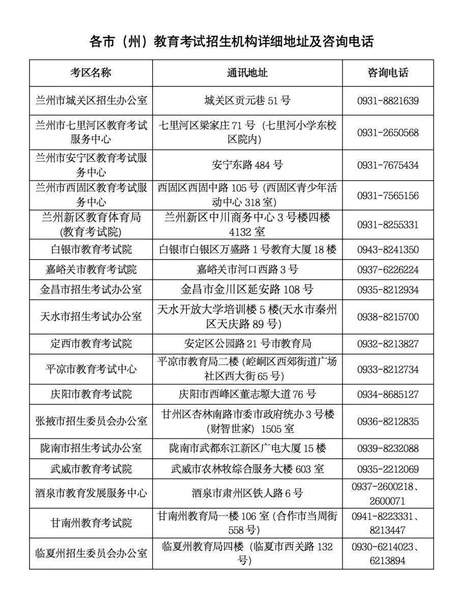 特別提醒:請(qǐng)考生密切關(guān)注各考區(qū)考點(diǎn)官網(wǎng)或微信公眾號(hào),及時(shí)了解本考區(qū)考點(diǎn)入場(chǎng)流程及有關(guān)規(guī)定,避免影響正??荚?。各考區(qū)咨詢電話及通信地址見附件