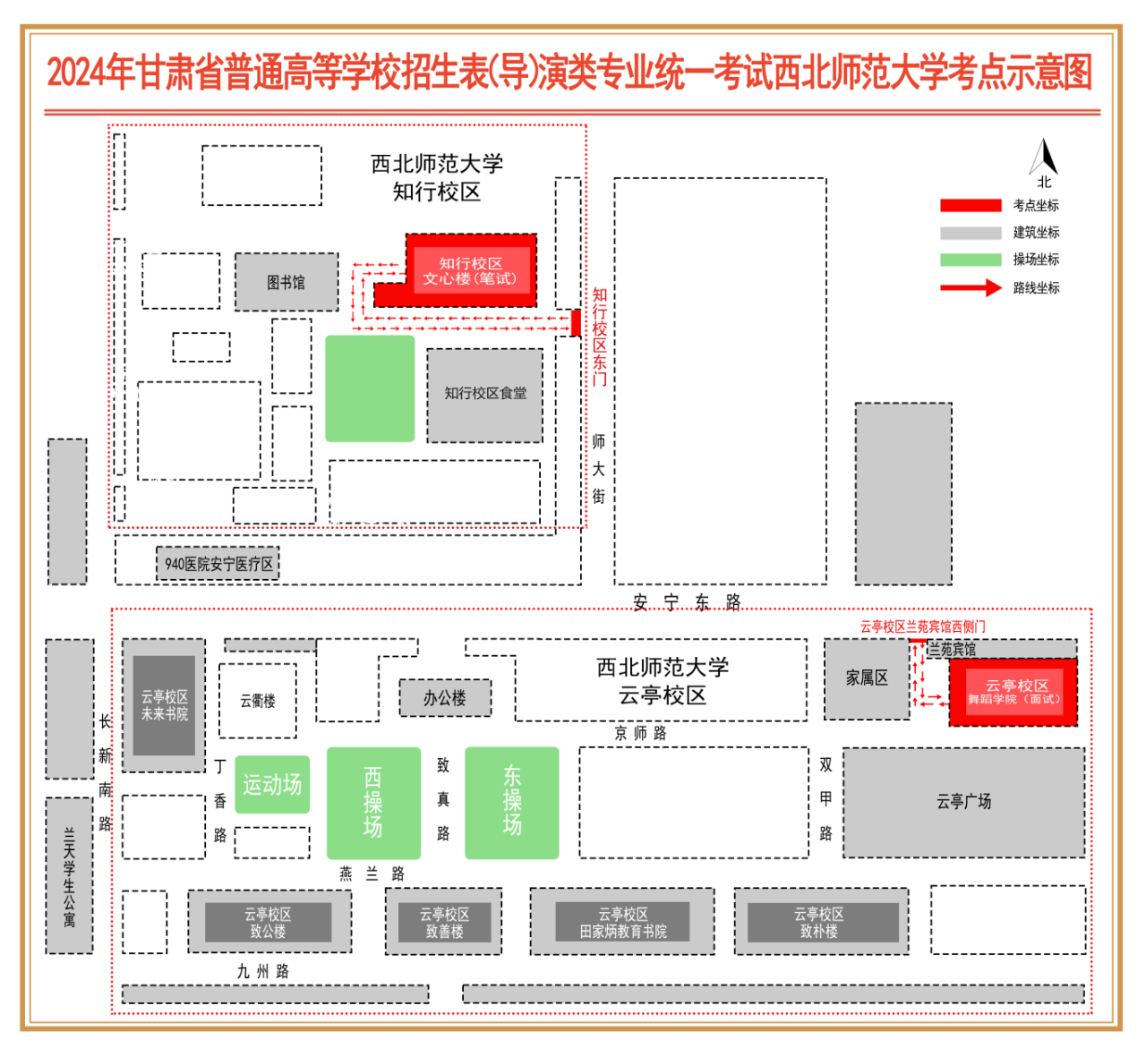 筆試考點設(shè)在西北師范大學(xué)知行校區(qū)(甘肅省蘭州市安寧區(qū)邱家灣37號)文心樓。