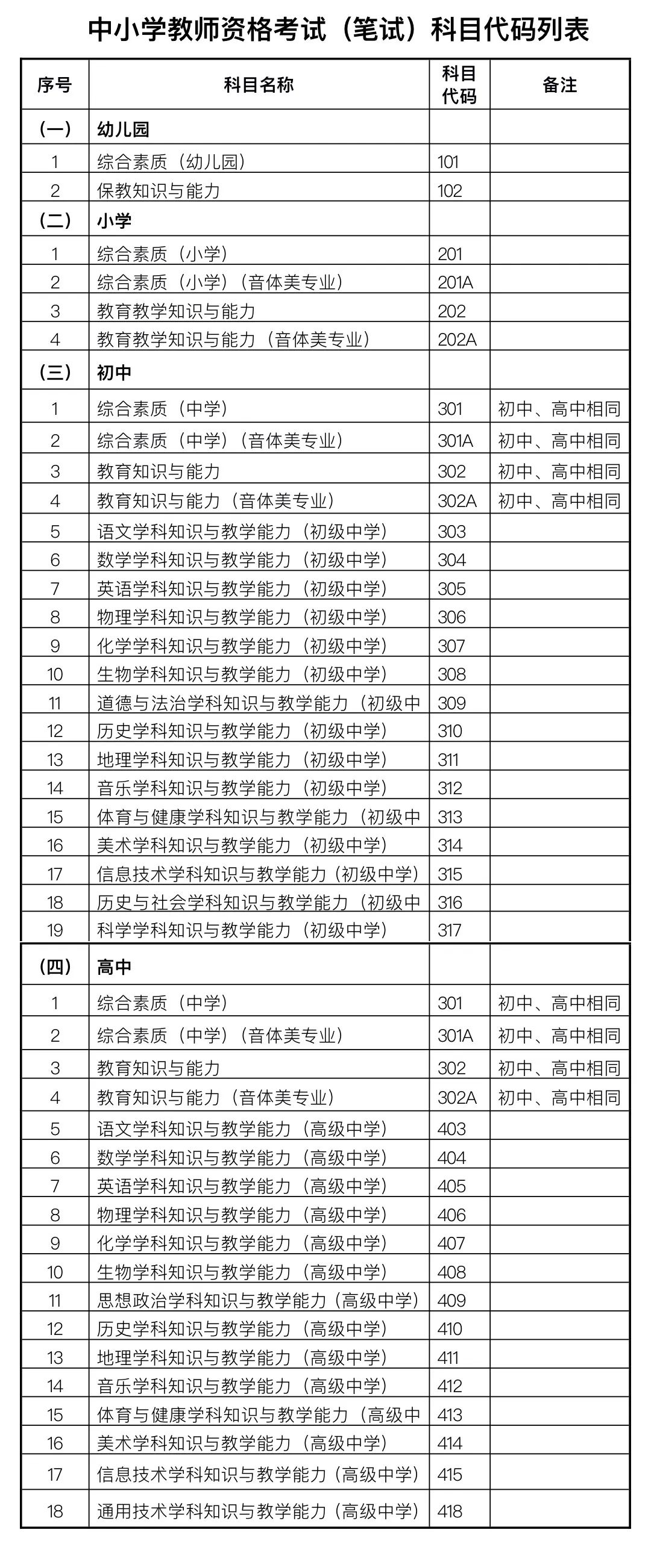 1.中小學(xué)教師資格考試(筆試)科目代碼列表