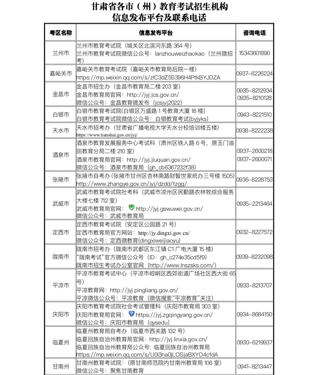 3.甘肅省各市(州)教育考試招生機(jī)構(gòu)信息發(fā)布平臺(tái)及聯(lián)系電話