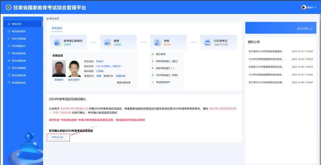 2024年甘肅省高考適應性演練測試準考證于1月14日開始打印。請所有參加本次適應性演練測試的考生在考前登陸甘肅省國家教育考試綜合管理平臺考生服務平臺https://kw.ganseea.cn/login,點擊“準考證打印”,即可下載準考證。下載途徑以及準考證示例如下: