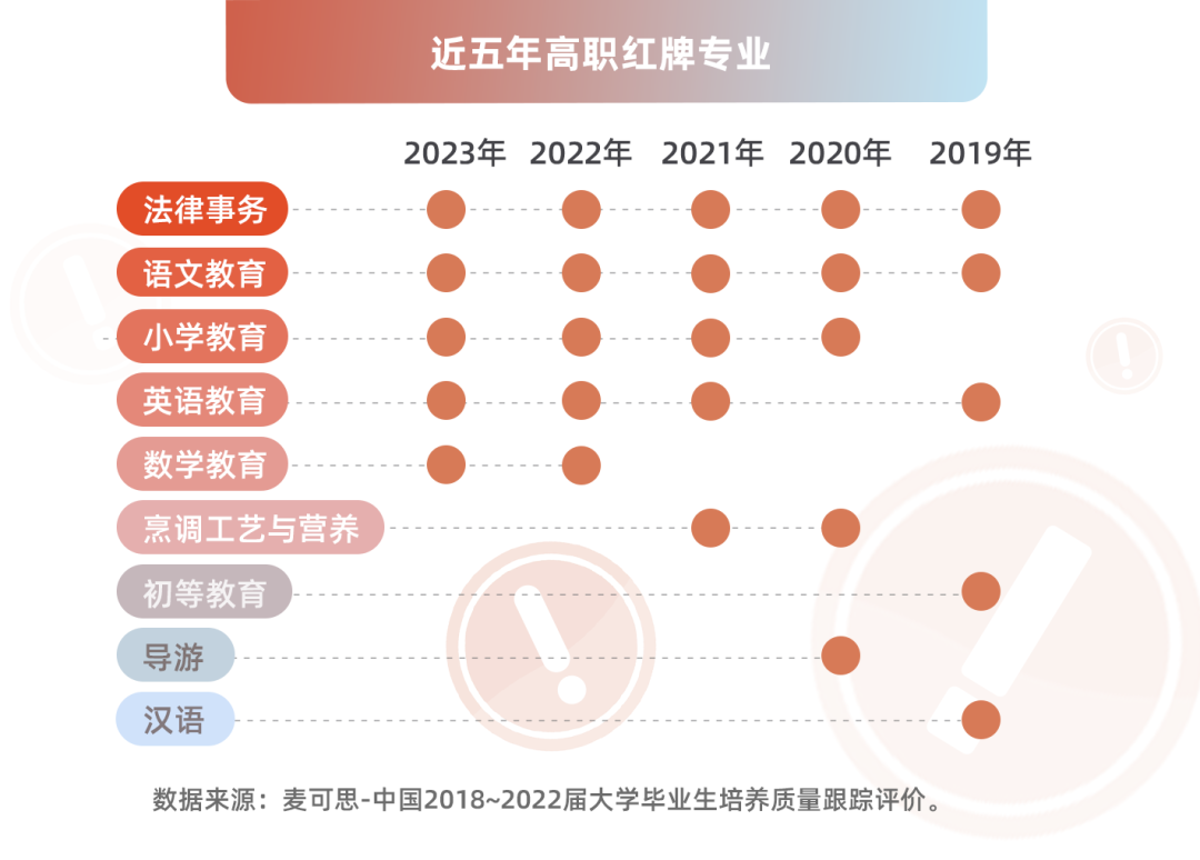 高職近5年被列為高職紅牌專業(yè)次數最多的是法律事務、語文教育(均為5次),其后是小學教育、英語教育(4次)。