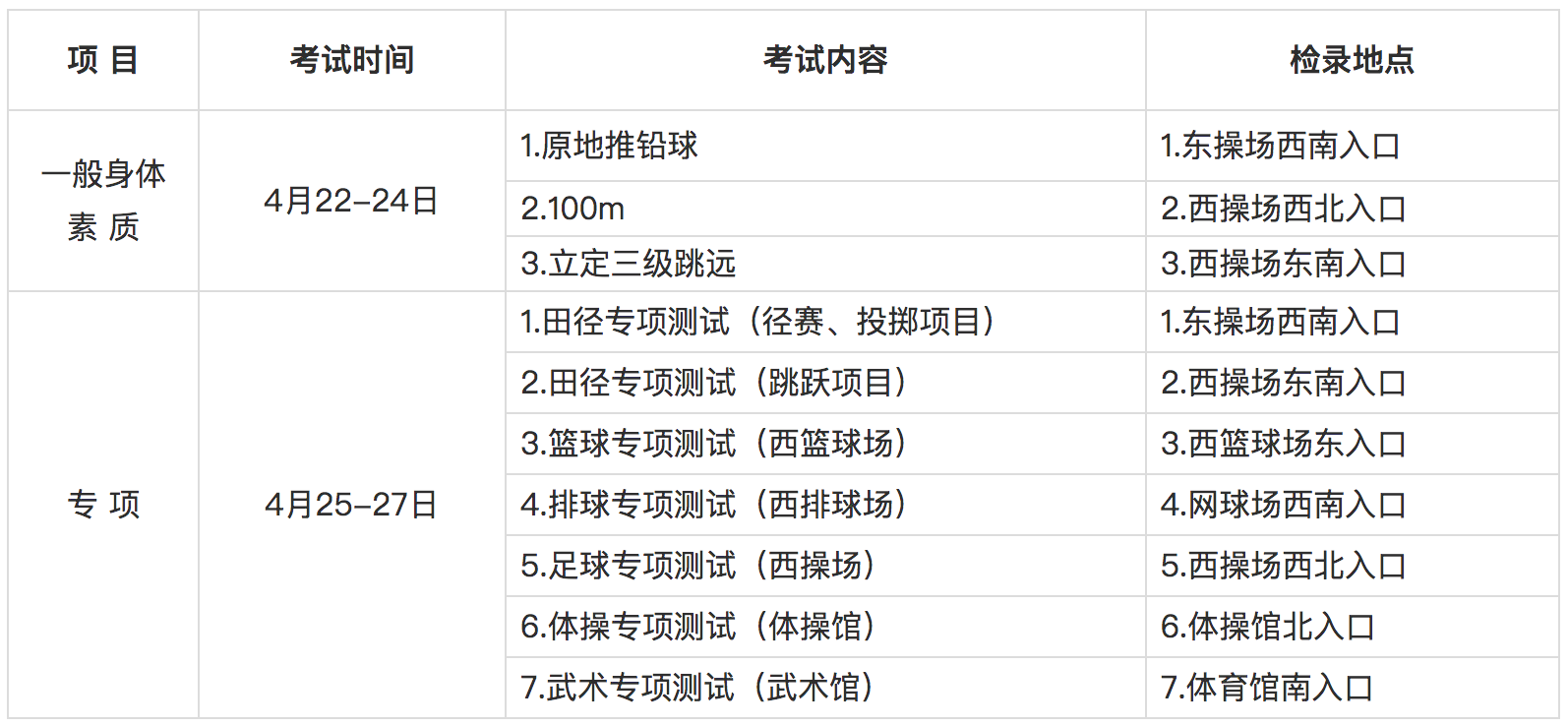 (四)測(cè)試采用分組輪換、集中測(cè)試的方式進(jìn)行,4月22-24日為一般身體素質(zhì)測(cè)試,4月25-27日為專項(xiàng)測(cè)試,考生具體考試時(shí)間以《專業(yè)準(zhǔn)考證》上公布為準(zhǔn)。