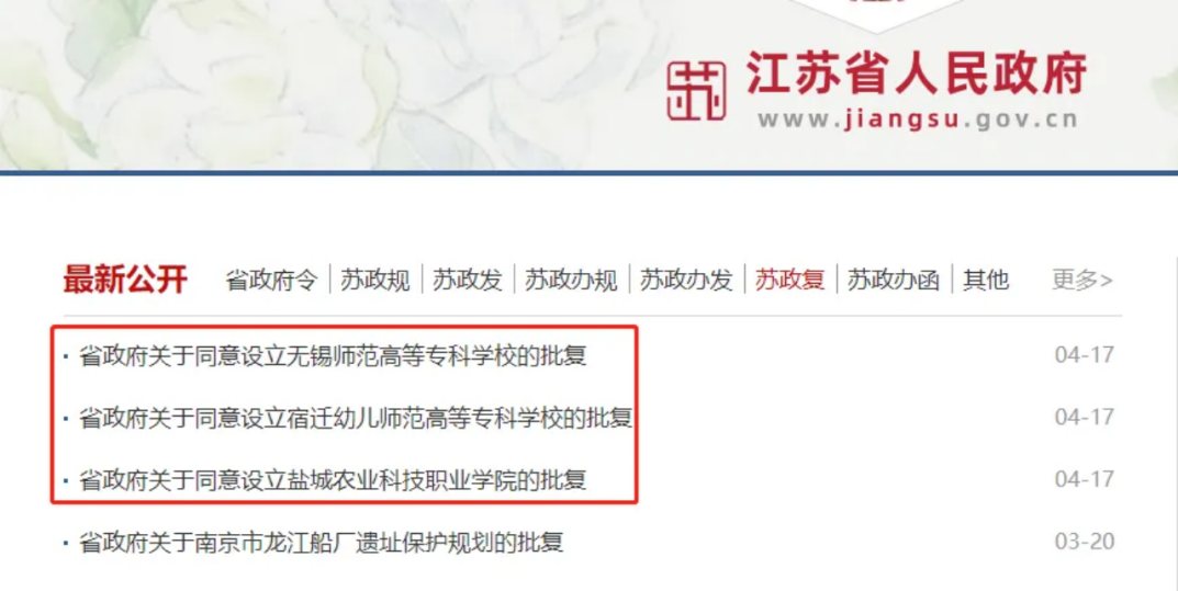 4月17日,江蘇省人民政府批復(fù)同意設(shè)立鹽城農(nóng)業(yè)科技職業(yè)學(xué)院、宿遷幼兒師范高等專科學(xué)校、無錫師范高等專科學(xué)校。