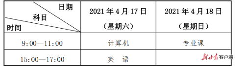 高職(專科)升本考試時(shí)間為4月17日至4月18日,考試科目分為公共課和專業(yè)課,公共課為計(jì)算機(jī)、英語(yǔ),每科滿分150分;專業(yè)課滿分為200分。