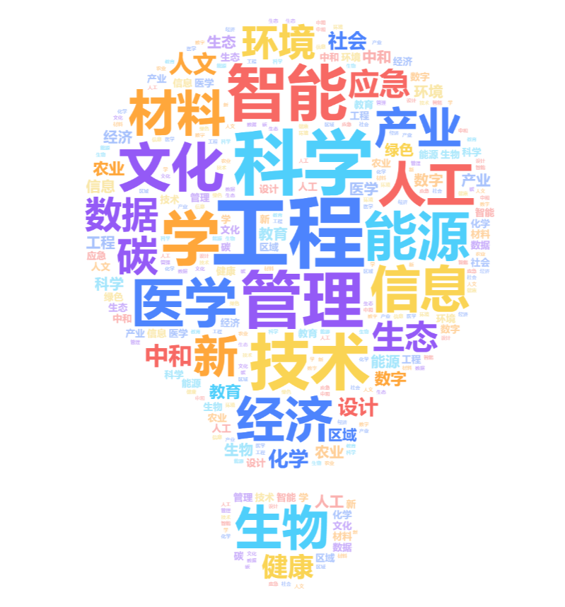 從各高校自設(shè)交叉學(xué)科的主題方向來(lái)看,“工程”“科學(xué)”“管理”“智能”“技術(shù)”“醫(yī)學(xué)”“能源”“信息”“文化”“經(jīng)濟(jì)”“材料”“數(shù)據(jù)”“生物”等關(guān)鍵詞出現(xiàn)的頻次較高。