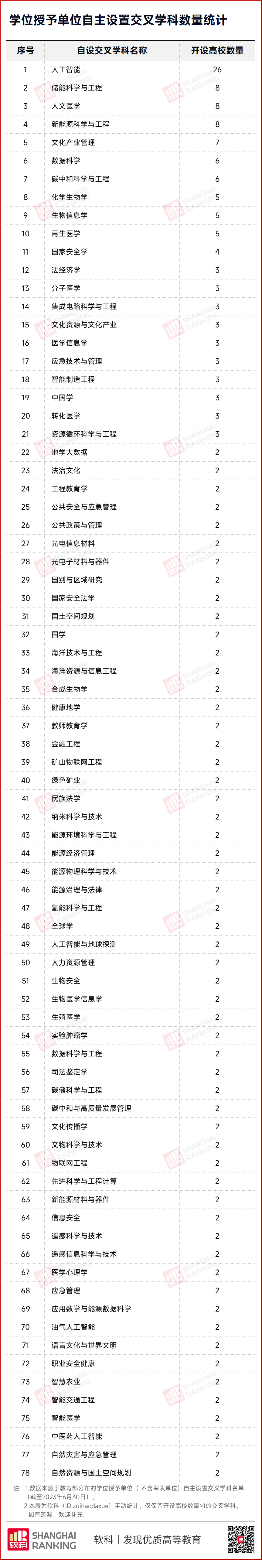 在706個(gè)交叉學(xué)科中,開(kāi)設(shè)高校數(shù)量大于1的有78個(gè),其中人工智能無(wú)疑是最熱門的交叉學(xué)科,共有26所高?!皳尀遍_(kāi)設(shè),儲(chǔ)能科學(xué)與工程、人文醫(yī)學(xué)、新能源科學(xué)與工程均有8所高校開(kāi)設(shè),文化產(chǎn)業(yè)管理(7所)、數(shù)據(jù)科學(xué)(6所)、碳中和科學(xué)與工程(6所)的開(kāi)設(shè)高校數(shù)量也均大于5所。