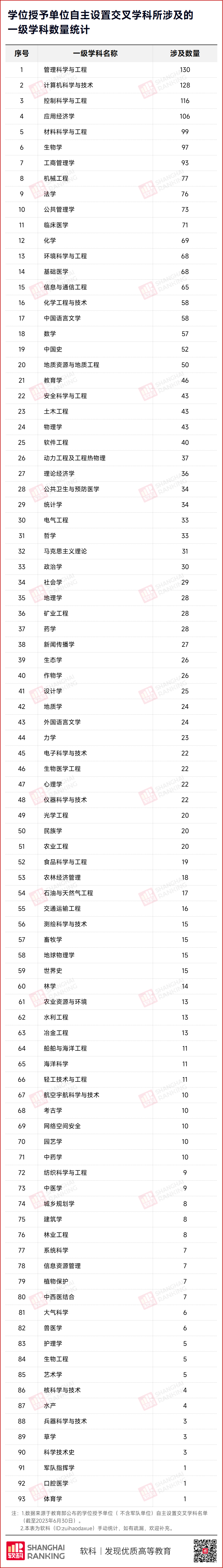 據(jù)統(tǒng)計(jì),有130個(gè)交叉學(xué)科所涉及的一級(jí)學(xué)科中都包含管理科學(xué)與工程,這是最受交叉學(xué)科“歡迎”的一級(jí)學(xué)科,此外,計(jì)算機(jī)科學(xué)與技術(shù)、控制科學(xué)與工程、應(yīng)用經(jīng)濟(jì)學(xué)三個(gè)學(xué)科的出現(xiàn)次數(shù)也均超過(guò)100次,集中在理工類、經(jīng)管類相關(guān)學(xué)科。人文社科方面,法學(xué)、中國(guó)語(yǔ)言文學(xué)和中國(guó)史這三個(gè)學(xué)科也受到超過(guò)50個(gè)新交叉學(xué)科的“青睞”。