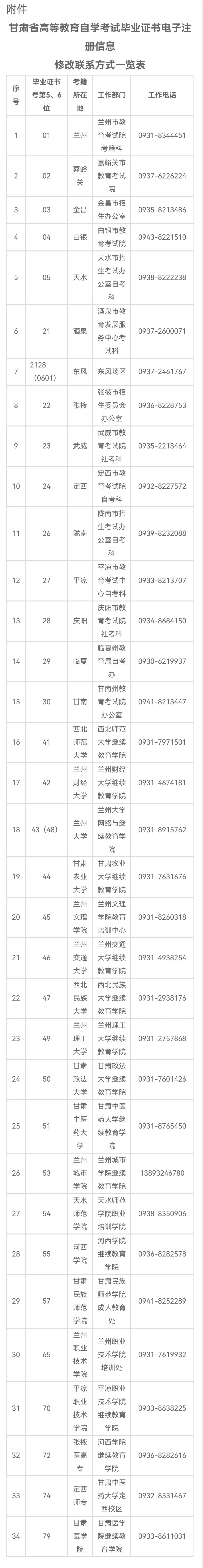 附件:甘肅省高等教育自學(xué)考試畢業(yè)證書電子注冊信息修改聯(lián)系方式一覽表