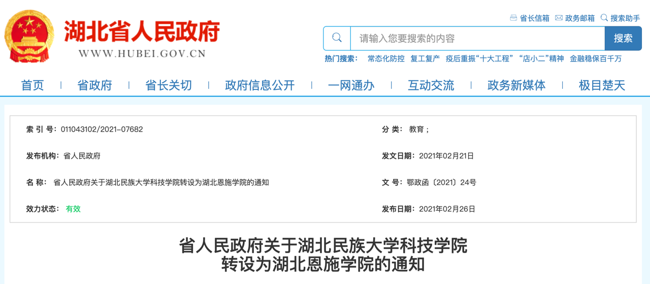 《省人民政府關(guān)于湖北民族大學(xué)科技學(xué)院轉(zhuǎn)設(shè)為湖北恩施學(xué)院的通知》