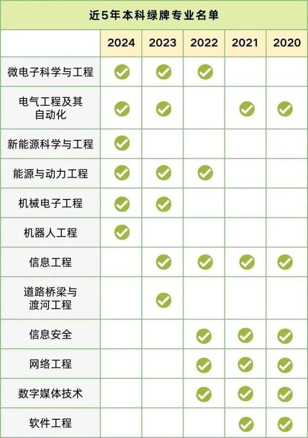 據(jù)《2024年中國(guó)本科生就業(yè)報(bào)告》統(tǒng)計(jì),近五年被列為綠牌次數(shù)最多的本科專業(yè)是信息工程、電氣工程及其自動(dòng)化(均為4次),其后是微電子科學(xué)及工程、信息安全、網(wǎng)絡(luò)工程、能源與動(dòng)力工程、數(shù)字媒體技術(shù)(均為3次)等。
