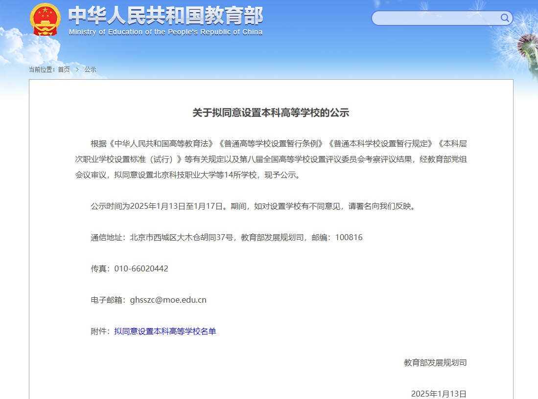 1月13日,教育部發(fā)布關(guān)于擬同意設(shè)置本科高等學(xué)校的公示。根據(jù)《中華人民共和國高等教育法》《普通高等學(xué)校設(shè)置暫行條例》《普通本科學(xué)校設(shè)置暫行規(guī)定》《本科層次職業(yè)學(xué)校設(shè)置標(biāo)準(zhǔn)(試行)》等有關(guān)規(guī)定以及第八屆全國高等學(xué)校設(shè)置評議委員會考察評議結(jié)果,經(jīng)教育部黨組會議審議,