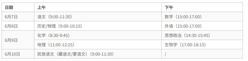 具體安排為:6月7日上午9:00-11:30考語文,下午15:00-17:00考數(shù)學(xué);6月8日上午9:00-10:15考物理或歷史,下午15:00-17:00考外語;6月9日上午8:30-9:45考化學(xué),11:00-12:15考地理,下午14:30-15:45考思想政治,17:00-18:15考生物學(xué);6月10日上午9:00-11:30考民族語文。
