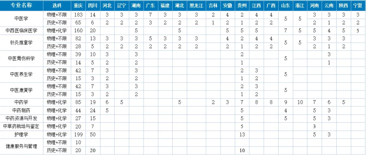 此外,安徽中醫(yī)藥大學(xué)、成都中醫(yī)藥大學(xué)、湖南中醫(yī)藥大學(xué)、甘肅中醫(yī)藥大學(xué)、河北中醫(yī)藥大學(xué)、海南醫(yī)科大學(xué)等高校的中醫(yī)學(xué)專業(yè),北京中醫(yī)藥大學(xué)、成都中醫(yī)藥大學(xué)、廣西中醫(yī)藥大學(xué)、湖北中醫(yī)藥大學(xué)、湖南中醫(yī)藥大學(xué)等高校的針灸推拿學(xué)專業(yè),由此前要求的“物化”雙選,調(diào)整為“不限”選科要求。