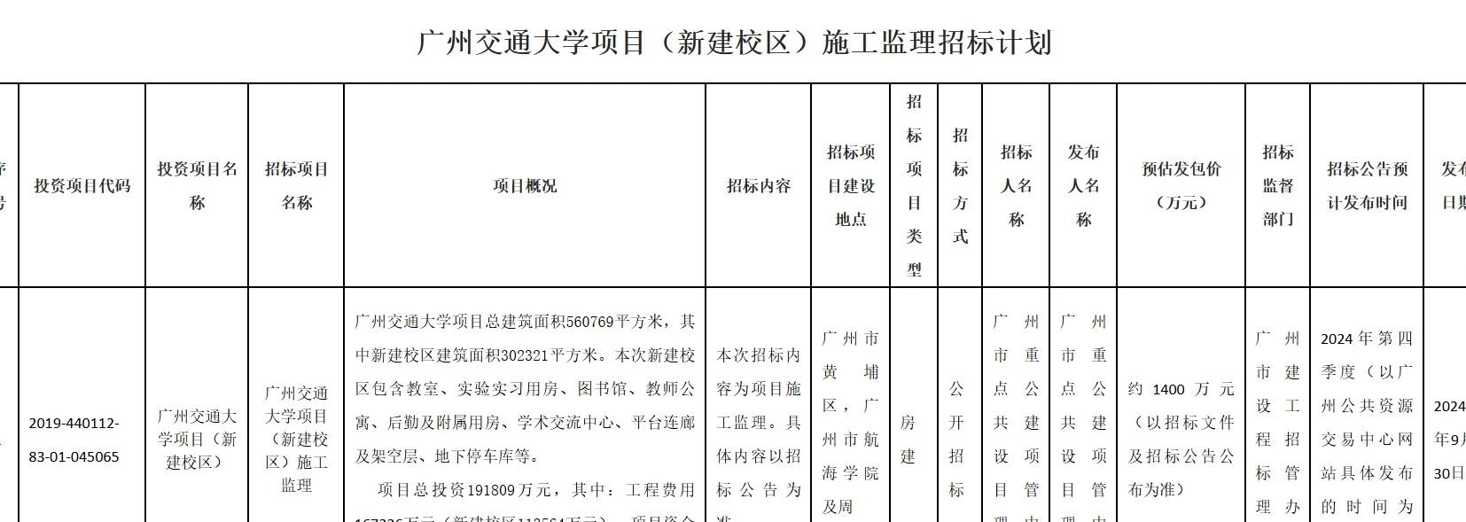 據(jù)招標(biāo)計(jì)劃顯示,廣州交通大學(xué)項(xiàng)目總建筑面積560769平方米,其中新建校區(qū)建筑面積302321平方米。項(xiàng)目總投資191809萬(wàn)元,其中:工程費(fèi)用167226萬(wàn)元(新建校區(qū)113564萬(wàn)元)。項(xiàng)目資金來源為市本級(jí)基本建設(shè)統(tǒng)籌資金。