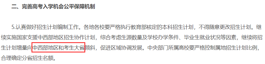 2月,教育部發(fā)布《關(guān)于做好2021年普通高校招生工作的通知》,《通知》中關(guān)于“完善高考入學(xué)機(jī)會(huì)公平保障機(jī)制”的部分,提到“繼續(xù)將招生計(jì)劃增量向中西部地區(qū)和考生大省傾斜”。