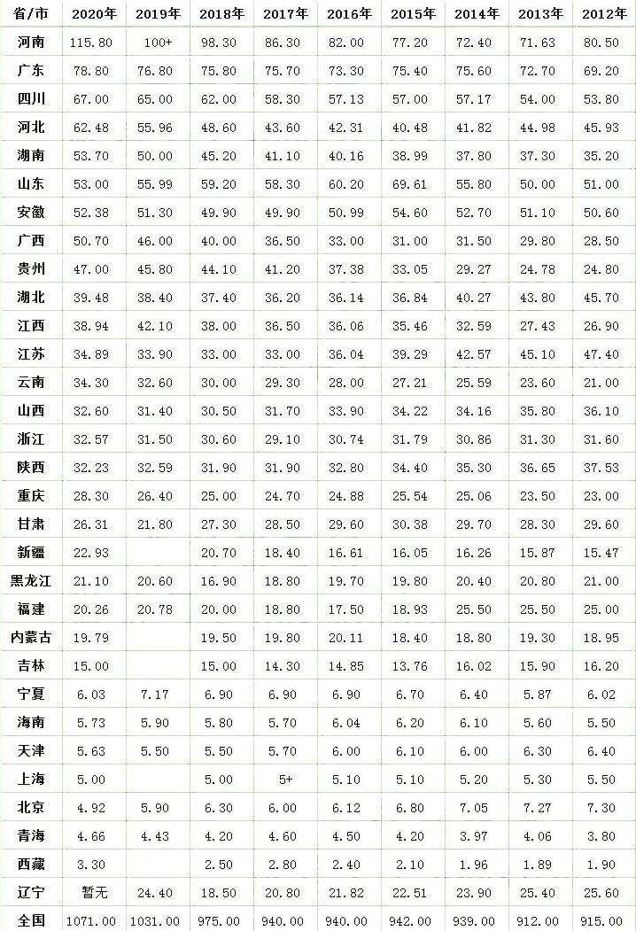 中西部地區(qū),是對(duì)我國中部地區(qū)和西部地區(qū)的總稱,其主要包括河北、山西、內(nèi)蒙古、吉林、黑龍江、安徽、江西、河南、湖北、湖南、廣西、海南、重慶、四川、貴州、云南、西藏、陜西、甘肅、青海、寧夏、新疆22個(gè)?。▍^(qū)、市)。然后,我們看下哪些省份屬于考生大?。?/strong>【2020年至2012年各省高考人數(shù)統(tǒng)計(jì)表】這張統(tǒng)計(jì)表中,統(tǒng)計(jì)了全國31個(gè)省市的考生人數(shù),2020年高考人數(shù)在40萬以上的省份,共有9個(gè)省份,分別是:河南、廣東、四川、河北、湖南、山東、安徽、廣西和貴州。我們看到,既是“中西部地區(qū)省份”,又是“考生大省”的,多達(dá)7個(gè),它們分別是河南、四川、河北、湖南、安徽、廣西、貴州。我相信,這幾個(gè)省的名字在每年的高考季,總有那么幾個(gè)你會(huì)聽到。它們的情況要么考生人數(shù)眾多,要么經(jīng)濟(jì)發(fā)展水平落后,要么省內(nèi)優(yōu)質(zhì)高校資源稀缺。