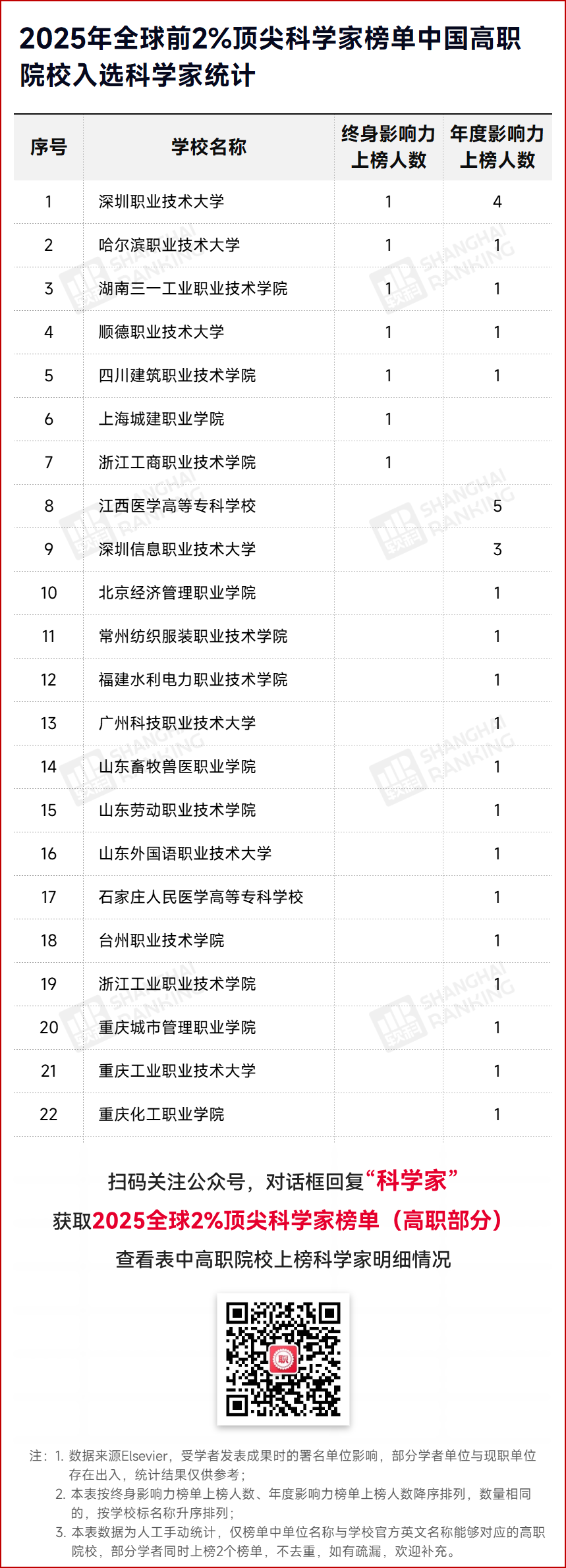 據(jù)【軟科職教】統(tǒng)計,中國共有12374位學(xué)者進(jìn)入“終身科學(xué)影響力排行榜”,有31685位學(xué)者入選“年度科學(xué)影響力排行榜”。其中,有22所高職院校的學(xué)者上榜。