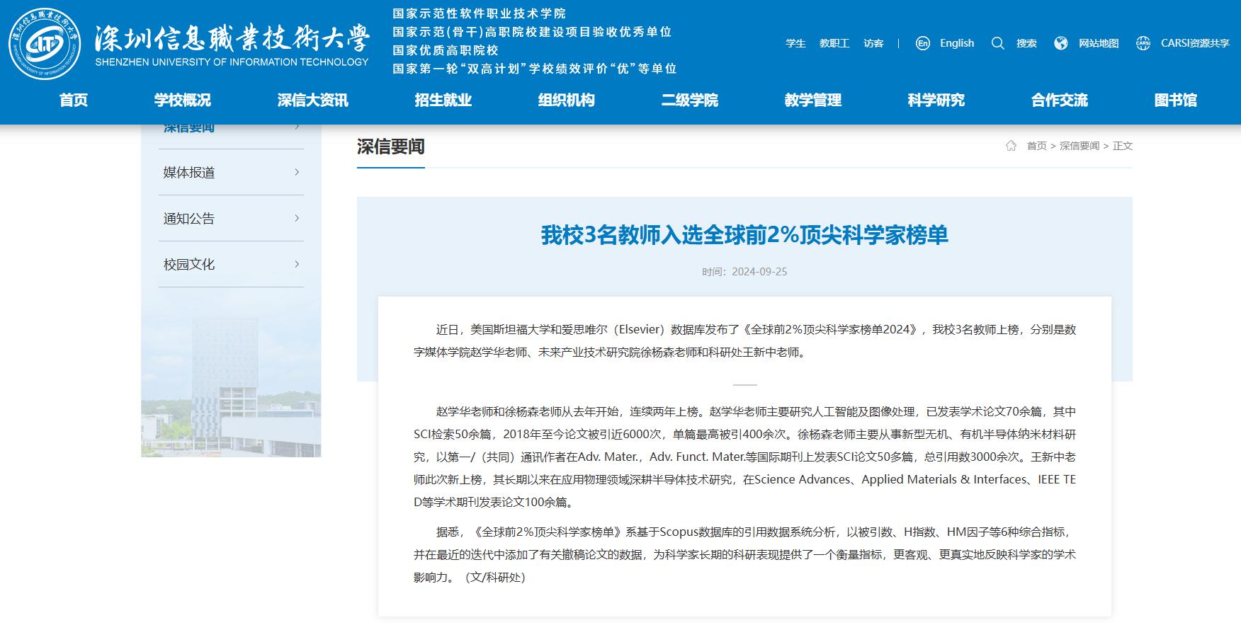 事實上,2025全球2%頂尖科學(xué)家榜單,并不是高職院校學(xué)者首次上榜。例如,今年剛剛升本的深圳信息職業(yè)技術(shù)大學(xué),學(xué)校教師王新中入選2024年度全球前2%頂尖科學(xué)家榜單,趙學(xué)華、徐楊森2位教師連續(xù)入選2023年、2024年及2025年該榜單。