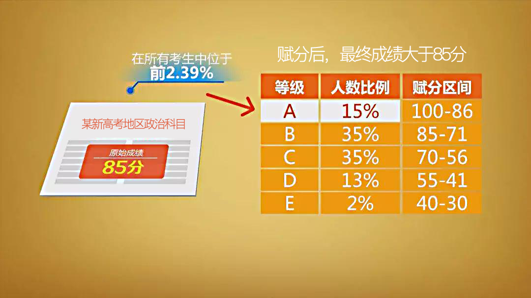 無論是“3+3”還是“3+1+2”模式,高考總分都是由必選科目卷面分+選考科目等級(jí)賦分構(gòu)成。等級(jí)賦分即將學(xué)生原始的卷面分?jǐn)?shù)由高到低進(jìn)行排序,分出若干等級(jí),再把等級(jí)轉(zhuǎn)化為具體的分?jǐn)?shù)。也就是說,你的選考科目成績(jī)主要取決于自己的排名情況,即使你交了白卷,排在最后一名,但依舊能拿到“起點(diǎn)分”。以等級(jí)賦分成績(jī)計(jì)入總成績(jī)的科目,從0到100分的卷面原始分區(qū)間壓縮到幾十至一百分的賦分區(qū)間,整體成績(jī)的區(qū)分度實(shí)際上降低了。若想要拉開差距,重點(diǎn)仍在按照原始分計(jì)入高考成績(jī)的語文、數(shù)學(xué)、外語(“3+1+2”模式還有物理/歷史)上。3.大學(xué)專業(yè)受選科限制,可選擇范圍變小