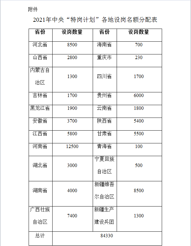 4月6日,教育部辦公廳、財(cái)政部辦公廳發(fā)布《2021年農(nóng)村義務(wù)教育階段學(xué)校教師特設(shè)崗位計(jì)劃實(shí)施工作的通知》(以下簡(jiǎn)稱“通知”),2021年全國計(jì)劃招聘特崗教師84330名,其中甘肅省特崗教師招聘5500人,比2020年增加100人。