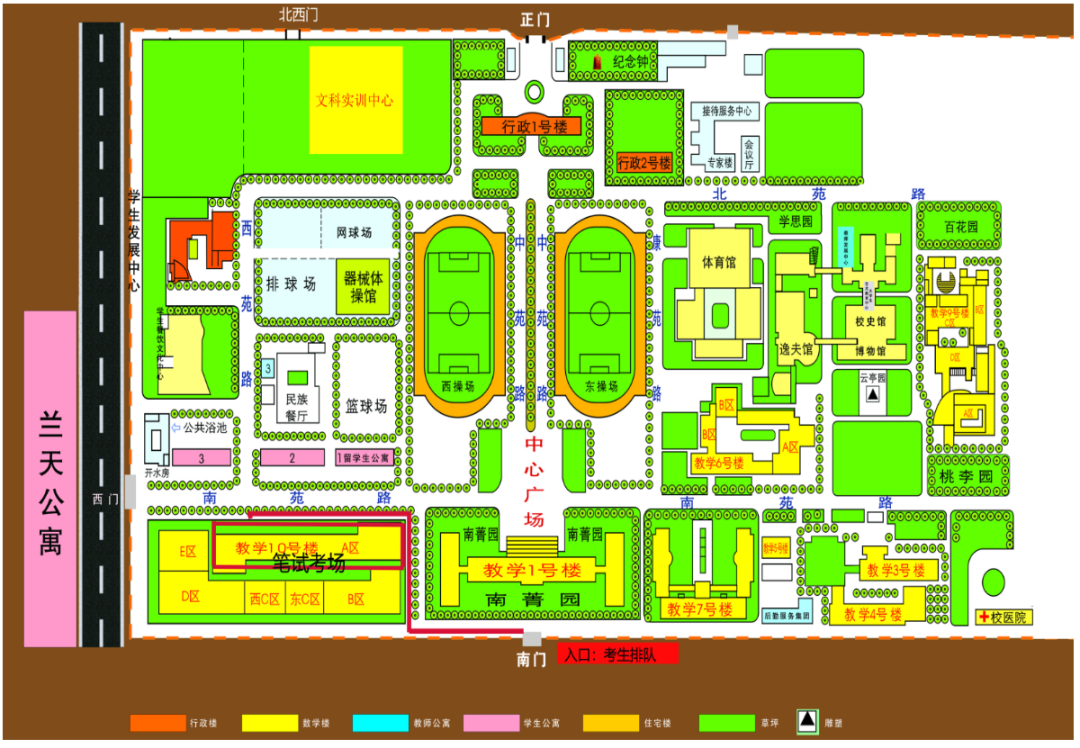 6.考試區(qū)域?qū)嵭虚]環(huán)管理,考生統(tǒng)一由西北師范大學(xué)南門(mén)進(jìn)出??忌鷳{《體育藝術(shù)類專業(yè)準(zhǔn)考證》《文化課準(zhǔn)考證》《居民身份證》《安全考試承諾書(shū)及身體健康狀況監(jiān)測(cè)表》及健康通行碼、行程卡截圖彩色打印件(或有效的核酸檢測(cè)陰性證明),按照規(guī)定的出入口及路線進(jìn)出相應(yīng)考點(diǎn)(詳見(jiàn)考場(chǎng)分布及考生入場(chǎng)安排、考點(diǎn)示意圖)。