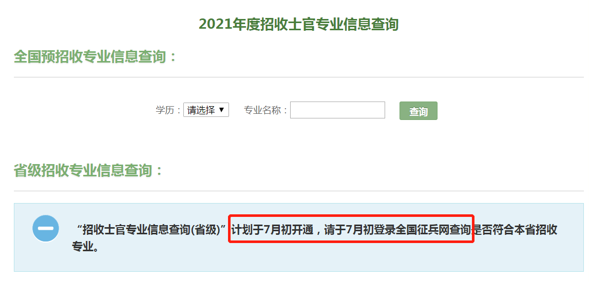 “招收士官專業(yè)信息查詢(省級)”計劃于7月初開通,請于7月初登錄全國征兵網查詢是否符合本省招收專業(yè)。