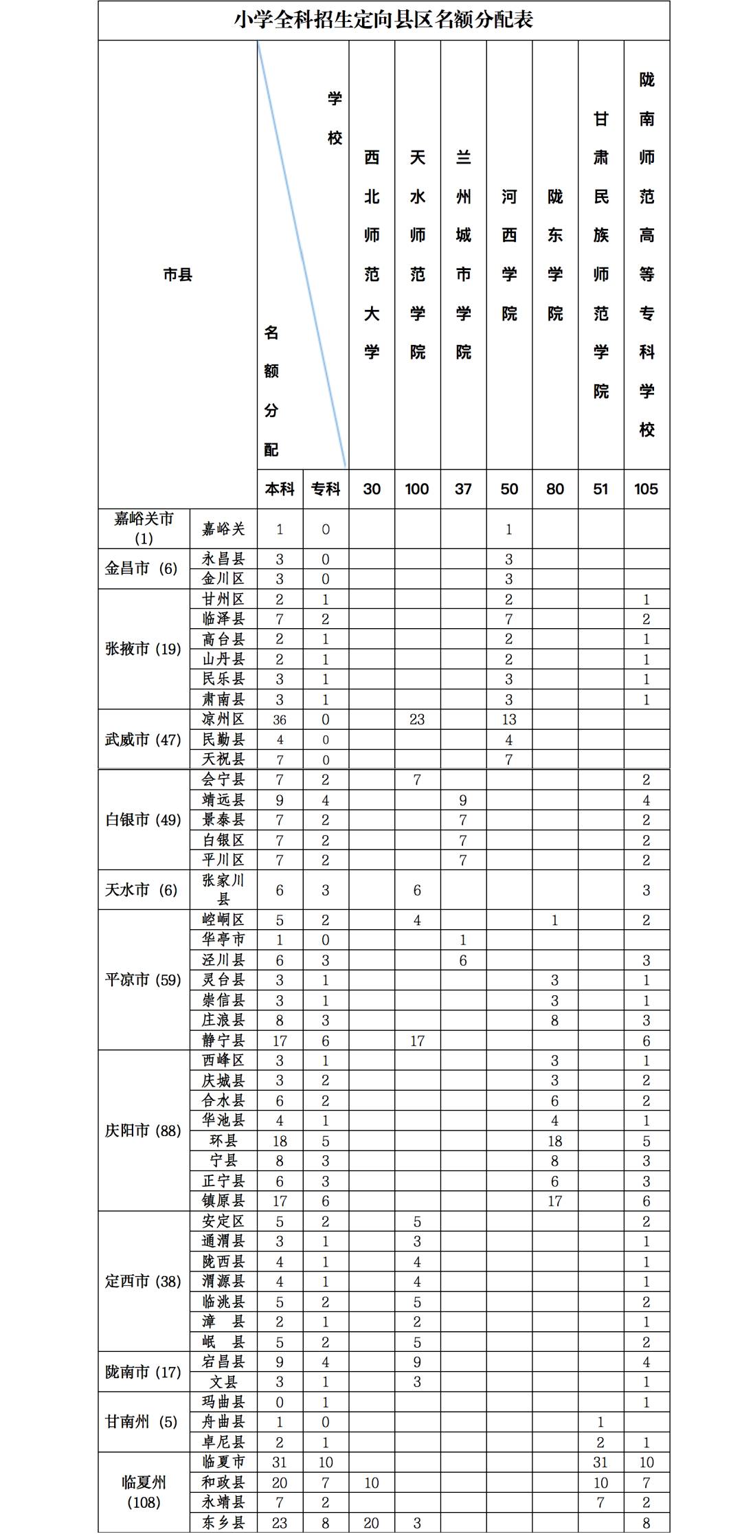 該計劃采取“指標(biāo)到縣、傾向招生、簽訂協(xié)議、合格聘用、定向服務(wù)”的培養(yǎng)模式,培養(yǎng)院校為西北師范大學(xué)、蘭州城市學(xué)院、天水師范學(xué)院、河西學(xué)院、隴東學(xué)院、甘肅民族師范學(xué)院、隴南師范高等??茖W(xué)校,培養(yǎng)專業(yè)為小學(xué)教育專業(yè),服務(wù)方向為鄉(xiāng)鎮(zhèn)及鄉(xiāng)鎮(zhèn)以下學(xué)校。