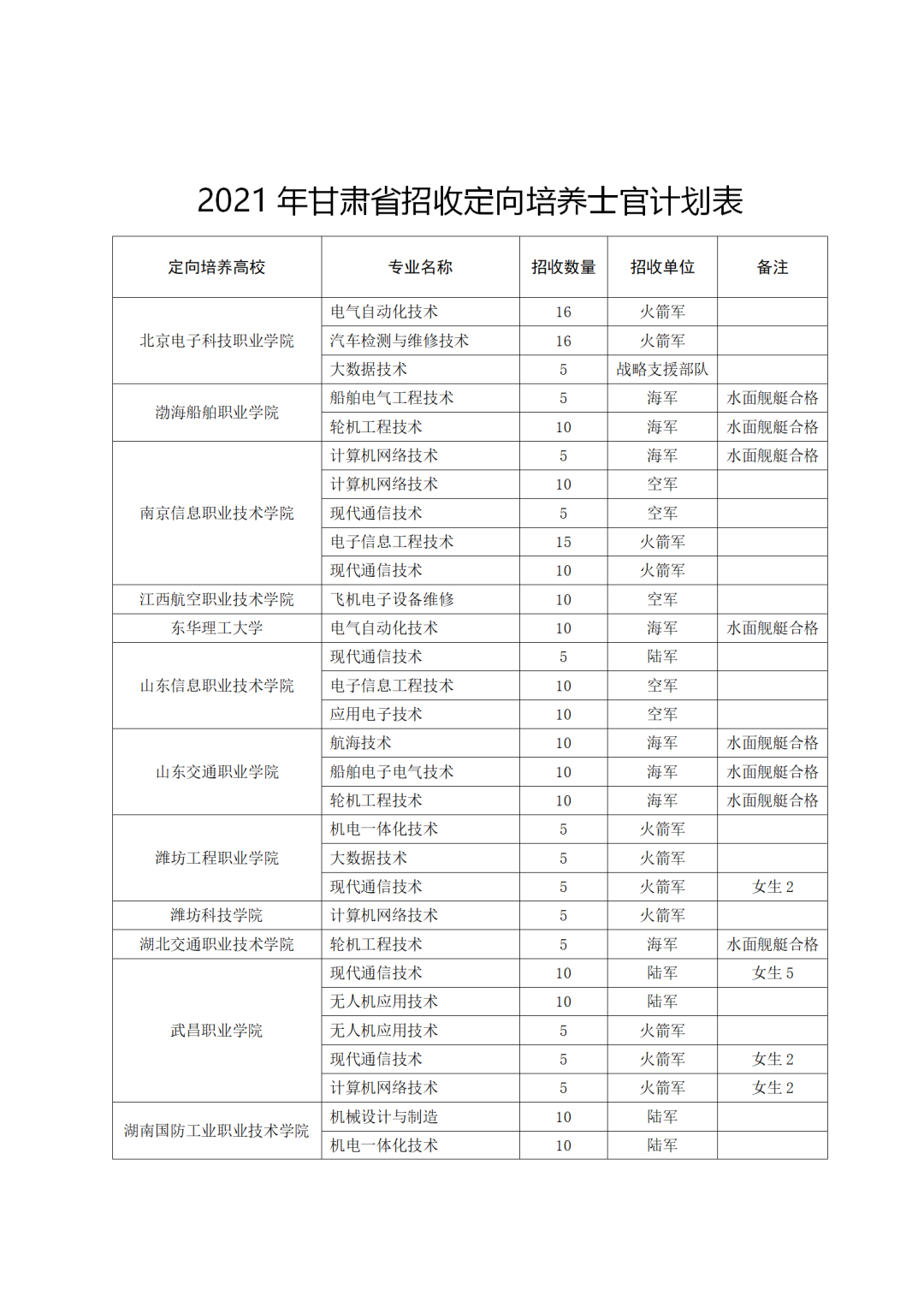 根據(jù)國家教育部、軍委政治工作部、軍委國防動員部《關(guān)于做好2021年招收定向培養(yǎng)士官工作的通知》要求,為深入貫徹軍民融合發(fā)展戰(zhàn)略,著力培養(yǎng)軍隊建設(shè)需要的高素質(zhì)士官人才,現(xiàn)就2021年我省招收定向培養(yǎng)士官工作有關(guān)問題公告如下: