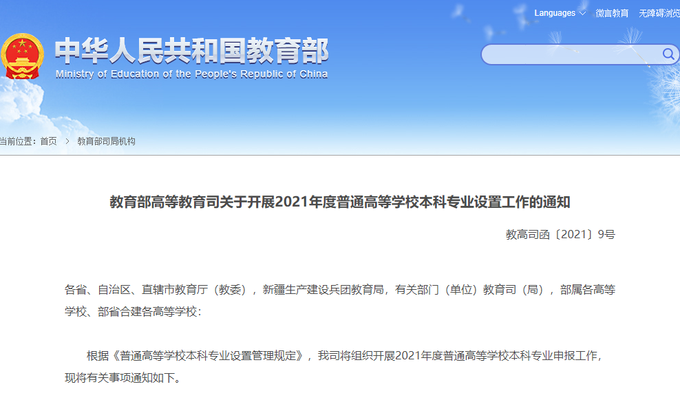 根據(jù)《普通高等學校本科專業(yè)設置管理規(guī)定》,我司將組織開展2021年度普通高等學校本科專業(yè)申報工作,現(xiàn)將有關事項通知如下。