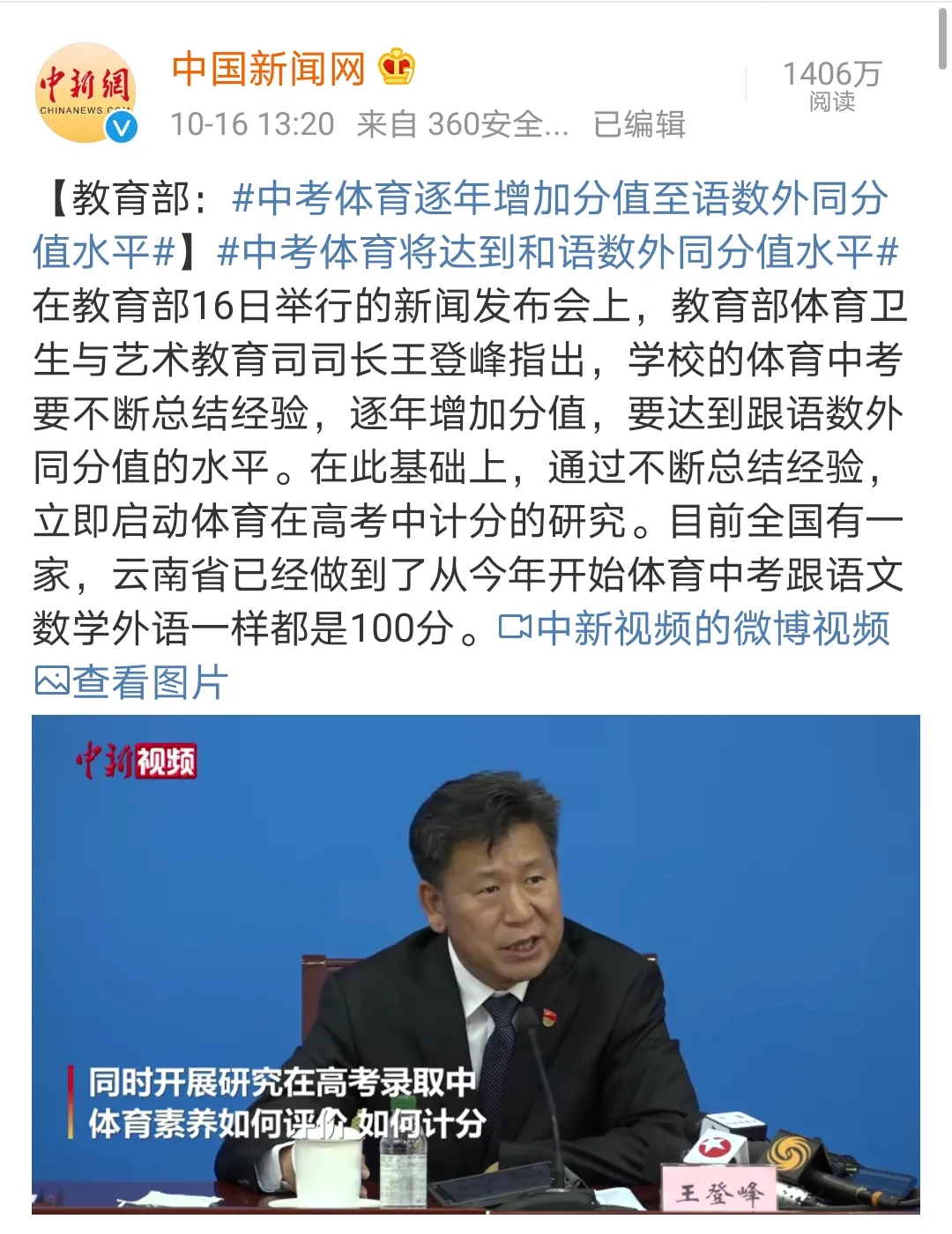 10月13日,中共中央、國務(wù)院印發(fā)了《深化新時代教育評價改革總體方案》以下是幾個方案要點:改進(jìn)中考體育測試內(nèi)容、方式和計分辦法,形成激勵學(xué)生加強(qiáng)體育鍛煉的有效機(jī)制。把中小學(xué)生學(xué)習(xí)音樂、美術(shù)、書法等藝術(shù)類課程以及參與學(xué)校組織的藝術(shù)實踐活動情況納入學(xué)業(yè)要求;探索將藝術(shù)類科目納入中考改革試點。穩(wěn)步推進(jìn)中高考改革,構(gòu)建引導(dǎo)學(xué)生德智體美勞全面發(fā)展的考試內(nèi)容體系,改變相對固化的試題形式,增強(qiáng)試題開放性,減少死記硬背和“機(jī)械刷題”現(xiàn)象。加快完善初、高中學(xué)生綜合素質(zhì)檔案建設(shè)和使用辦法,逐步轉(zhuǎn)變簡單以考試成績?yōu)槲ㄒ粯?biāo)準(zhǔn)的招生模式。10月16日,教育部召開新聞發(fā)布會,此次發(fā)布會中教育部重點強(qiáng)調(diào)了兩件事情:1. 學(xué)校的體育中考要逐年增加分值,達(dá)到跟語數(shù)外同分值的水平。2. 2022年,要全面實行美育(美術(shù)、體育)中考。美育課程以藝術(shù)課程為主體,主要包括音樂、美術(shù)、書法、舞蹈、戲劇、戲曲、影視等課程。