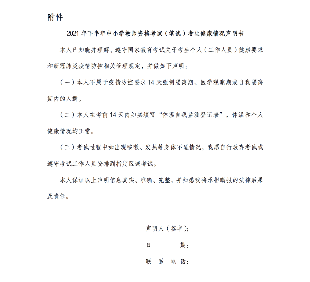 1.防疫須知:考生須自備口罩前往考點,自覺接受體溫檢測,并提交有效期內(nèi)“甘肅省健康出行碼”截圖A4紙打印件(須本人簽字,如報考多個科目,只需參加首場考試時提交即可)、《2021年下半年中小學(xué)教師資格考試(筆試)考生健康情況聲明書》及《2021年下半年中小學(xué)教師資格考試(筆試)考生考前14天體溫自我監(jiān)測登記表》(須本人簽字,如報考多個科目,只需參加首場考試時提交即可),考前14天內(nèi)從境外或非低風(fēng)險地區(qū)的來甘返甘考生,須全員接受新冠病毒核酸檢測。疫情中高風(fēng)險地區(qū)返甘的考生須進行14天居家隔離,并在進入考點時,須提交由省內(nèi)疾控機構(gòu)或醫(yī)療衛(wèi)生機構(gòu)出具的7日內(nèi)新冠病毒核酸檢測報告(原件及復(fù)印件),方可進入考點參加考試,如無法提供相關(guān)健康證明的考生將嚴禁入場考試。