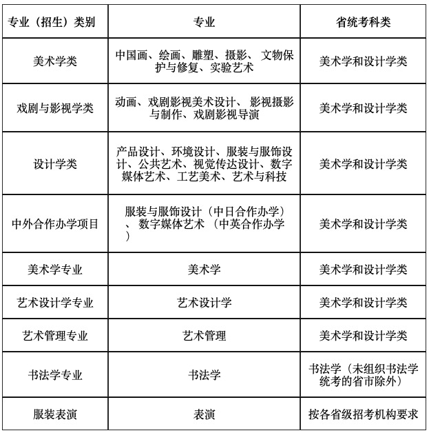 根據(jù)各省、自治區(qū)、直轄市關(guān)于藝術(shù)類統(tǒng)考科類的設(shè)置 ,經(jīng)各省級(jí)招生考試機(jī)構(gòu)審核,將我校各專業(yè)類別對(duì)應(yīng)統(tǒng)考科類要求公布如下: