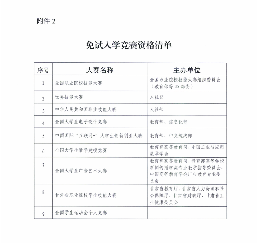 3.全國(guó)學(xué)生運(yùn)動(dòng)會(huì)個(gè)人競(jìng)賽項(xiàng)目中進(jìn)入前3名的應(yīng)屆畢業(yè)生。在教育部高等教育司和行業(yè)主管部門共同主辦的數(shù)學(xué)建模競(jìng)賽、廣告藝術(shù)大賽(高職組)中獲得個(gè)人國(guó)家三等獎(jiǎng)及以上的應(yīng)屆畢業(yè)生。