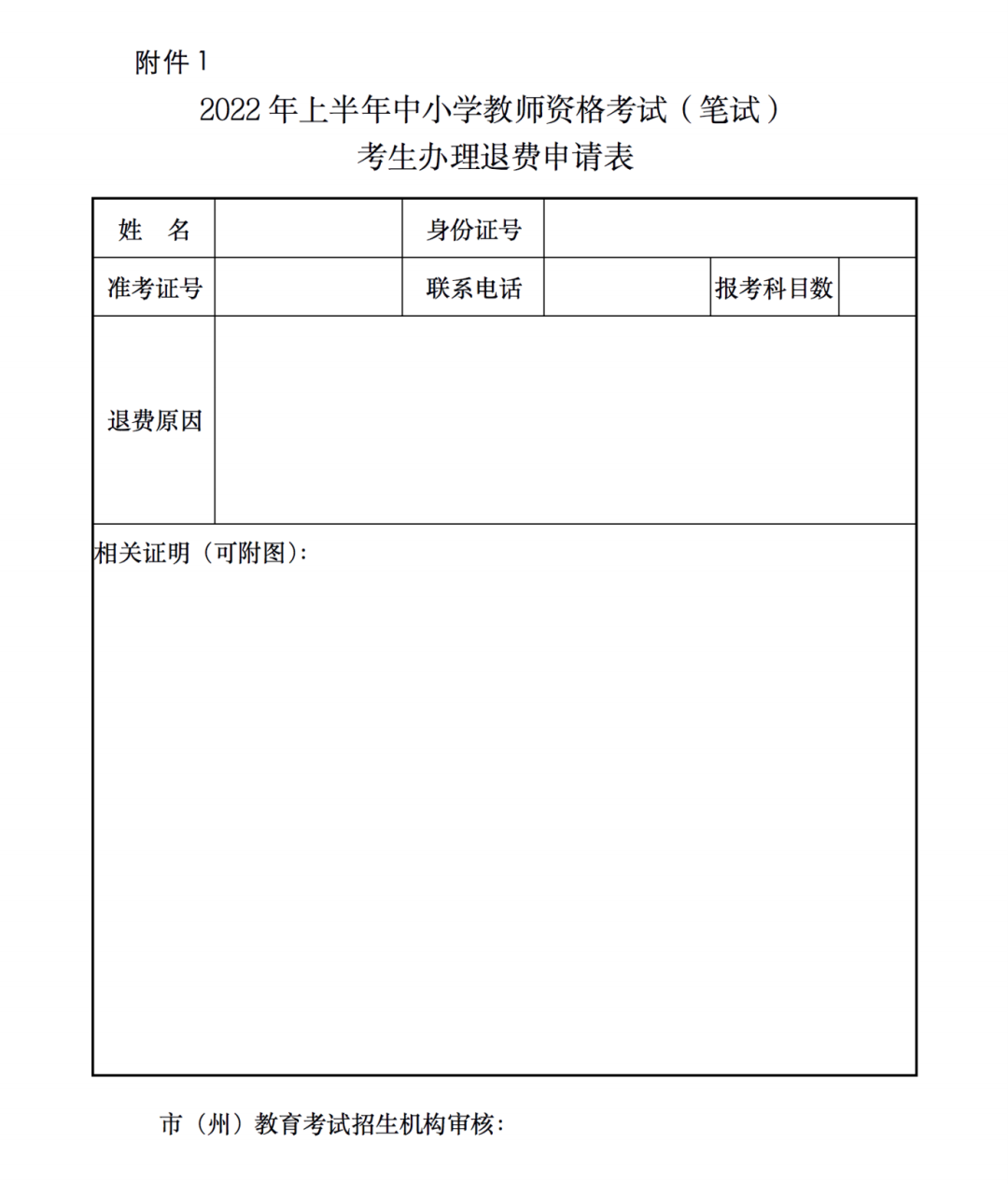 申請(qǐng)退費(fèi)的考生需填寫《2022年上半年中小學(xué)教師資格考試(筆試)考生辦理退費(fèi)申請(qǐng)表》(附件1),填寫信息須與報(bào)名信息一致。填寫退費(fèi)原因,至少1項(xiàng)能證明本人因疫情防控原因未能參加考試的相關(guān)材料(如手機(jī)短信截圖、考試期間“健康碼”“行程卡”截圖,所在社區(qū)張貼的通知公告、屬地疫情防控等部門(單位)的相關(guān)通知等),截圖應(yīng)清晰完整,并粘貼至附件1中。