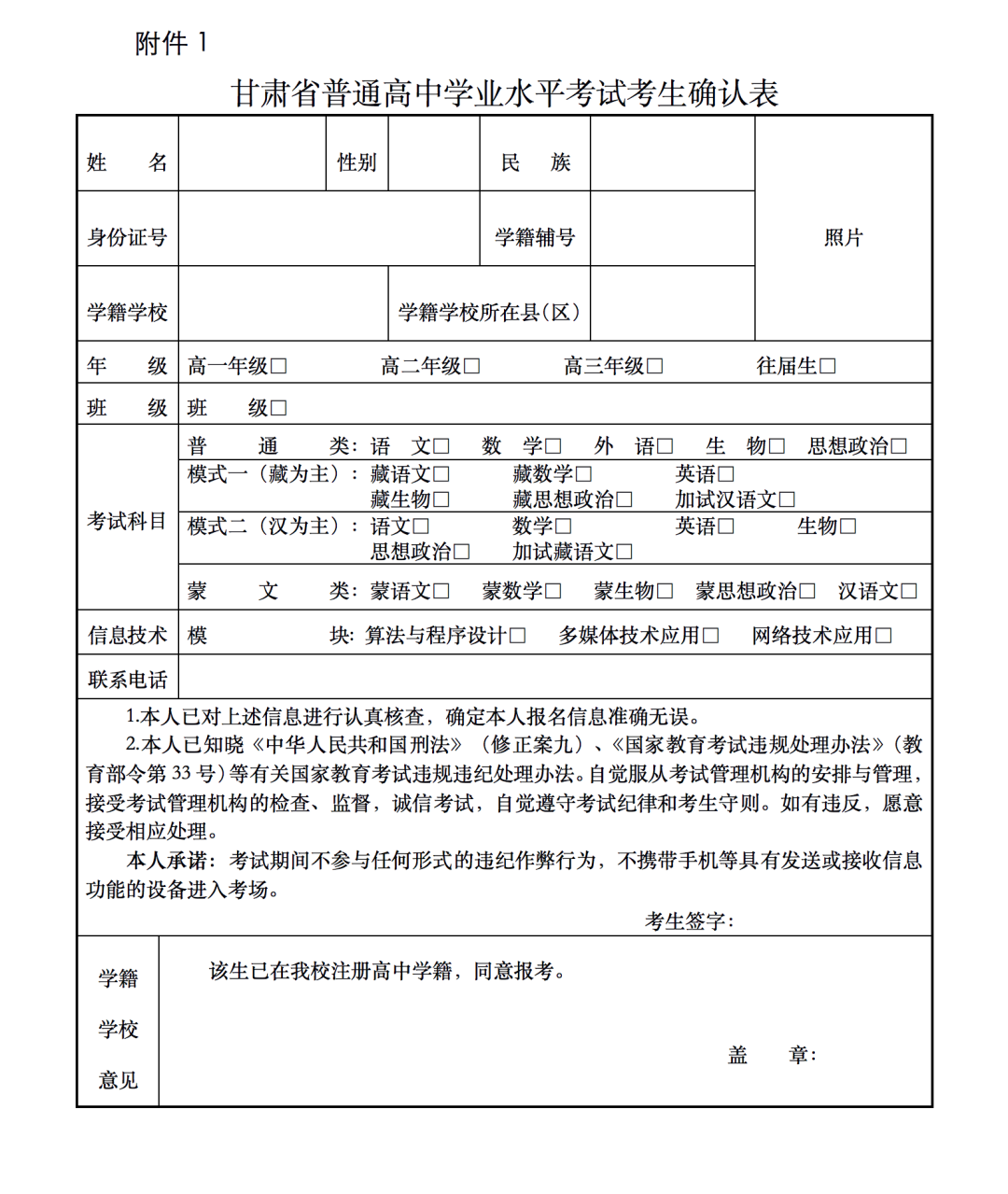 1.甘肅省普通高中學(xué)業(yè)水平考試考生確認(rèn)表