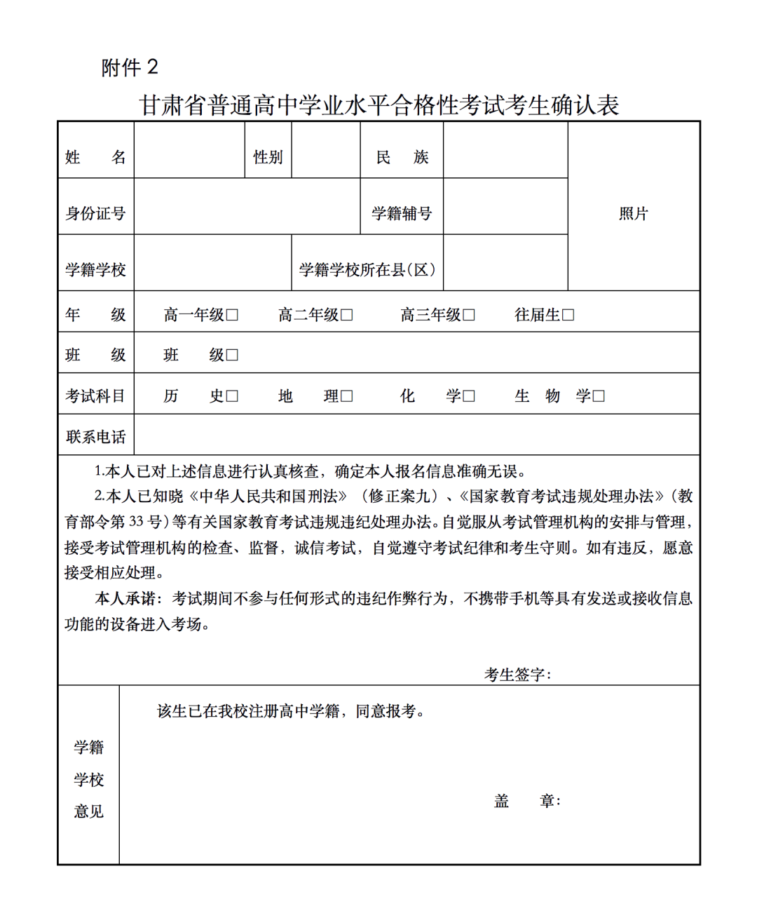 2.甘肅省普通高中學(xué)業(yè)水平合格性考試考生確認(rèn)表