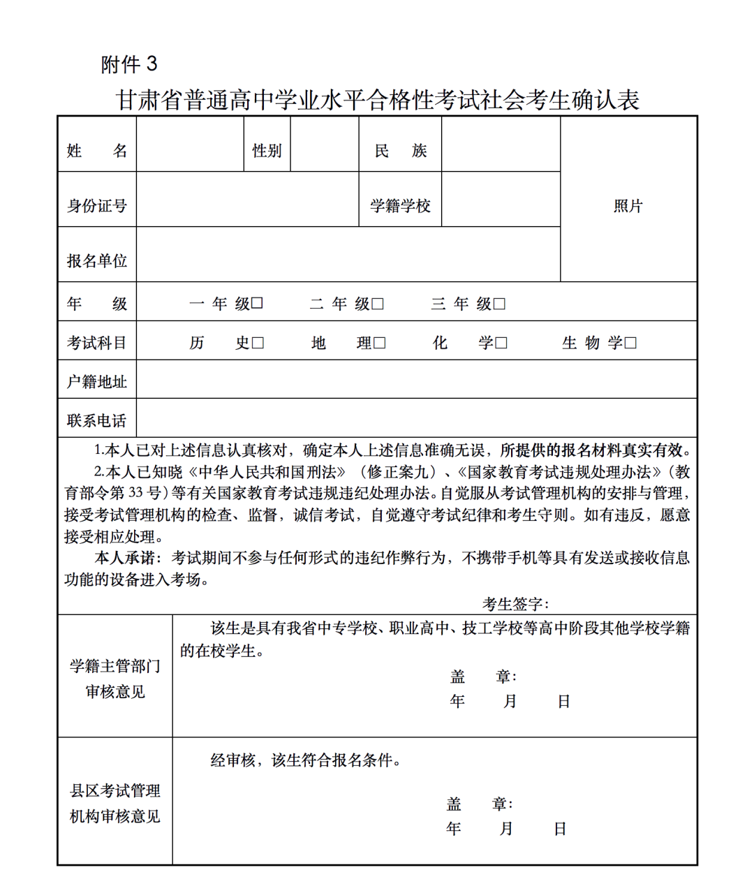 3.甘肅省普通高中學(xué)業(yè)水平合格性考試社會(huì)考生確認(rèn)表