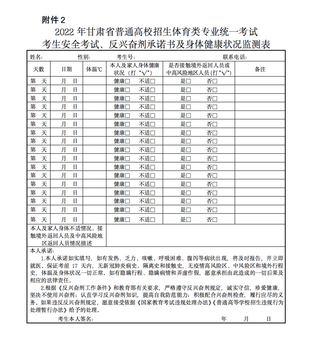 2.2022年甘肅省普通高校招生體育類專業(yè)統(tǒng)一考試考生安全考試、反興奮劑承諾書及身體健康狀況監(jiān)測表