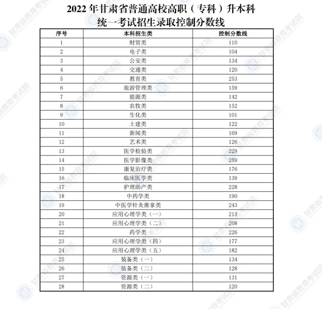 2022年甘肅省普通專升本考試招生錄取控制分?jǐn)?shù)線公布