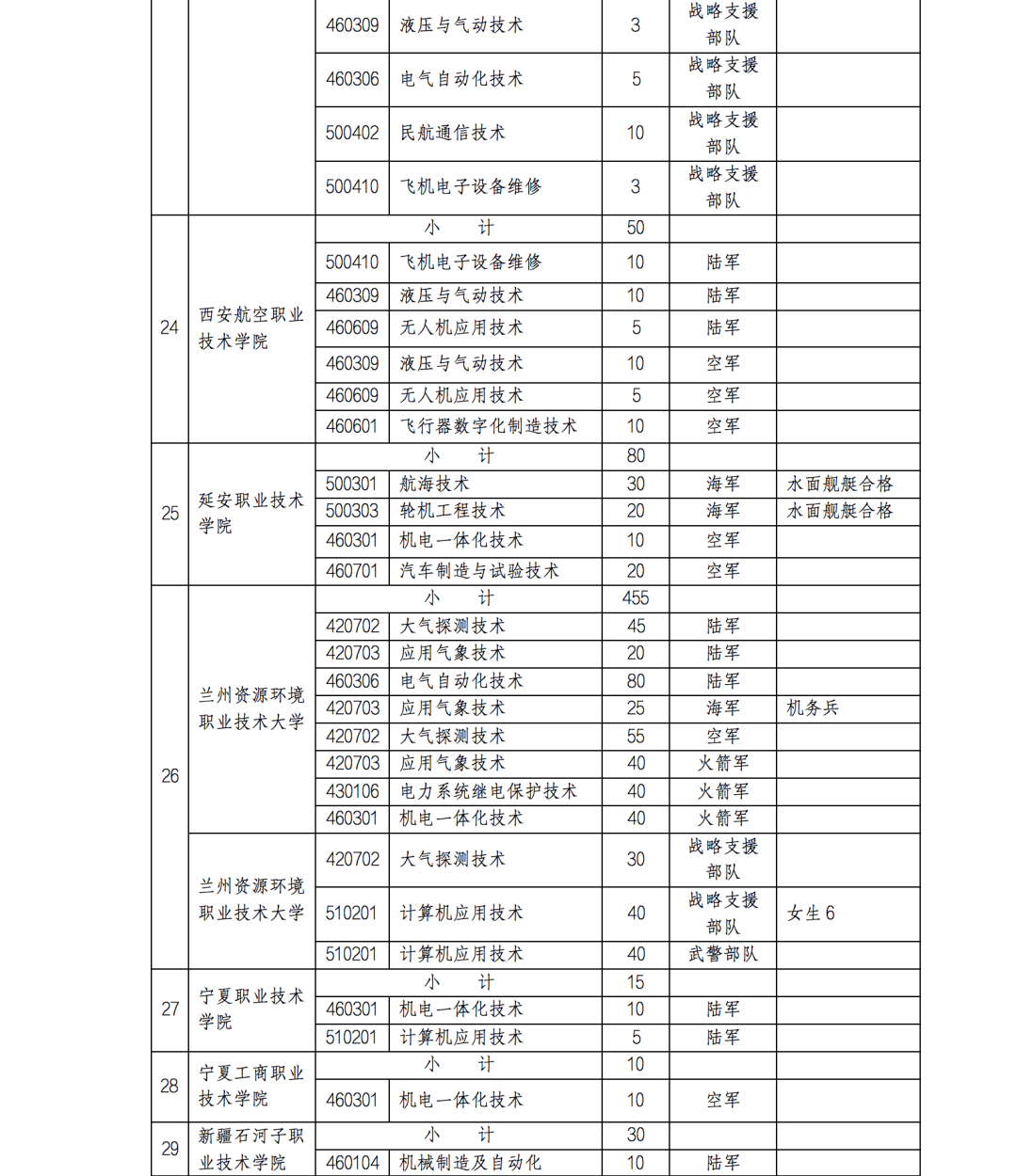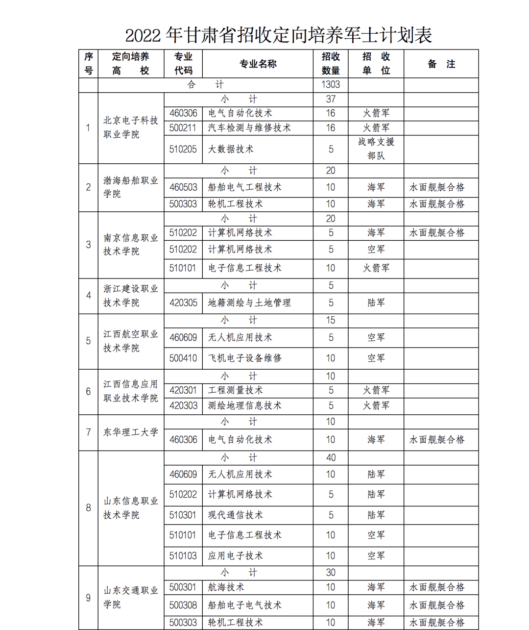 1.2022年甘肅省招收定向培養(yǎng)軍士計(jì)劃表