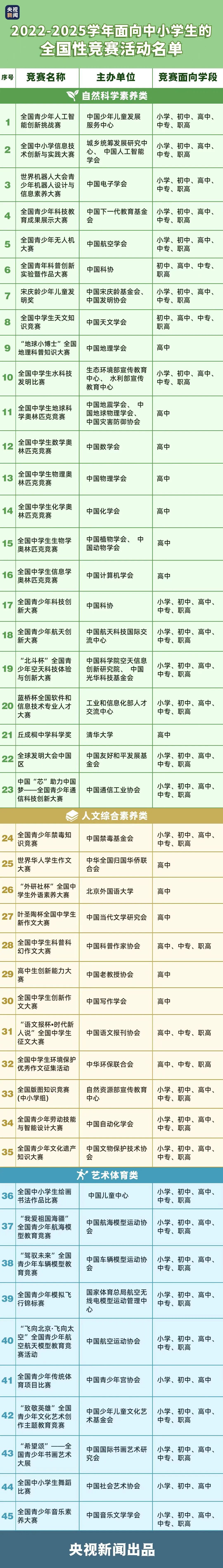 教育部辦公廳23日發(fā)布通知,公示2022-2025學(xué)年面向中小學(xué)生的全國(guó)性競(jìng)賽活動(dòng)名單。