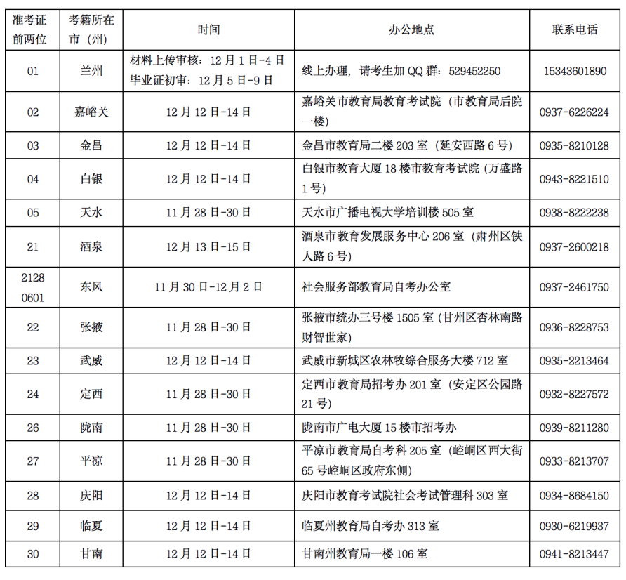 2022年下半年甘肅省高等教育自學(xué)考試社會(huì)型考生各市州畢業(yè)初審時(shí)間及聯(lián)系方式