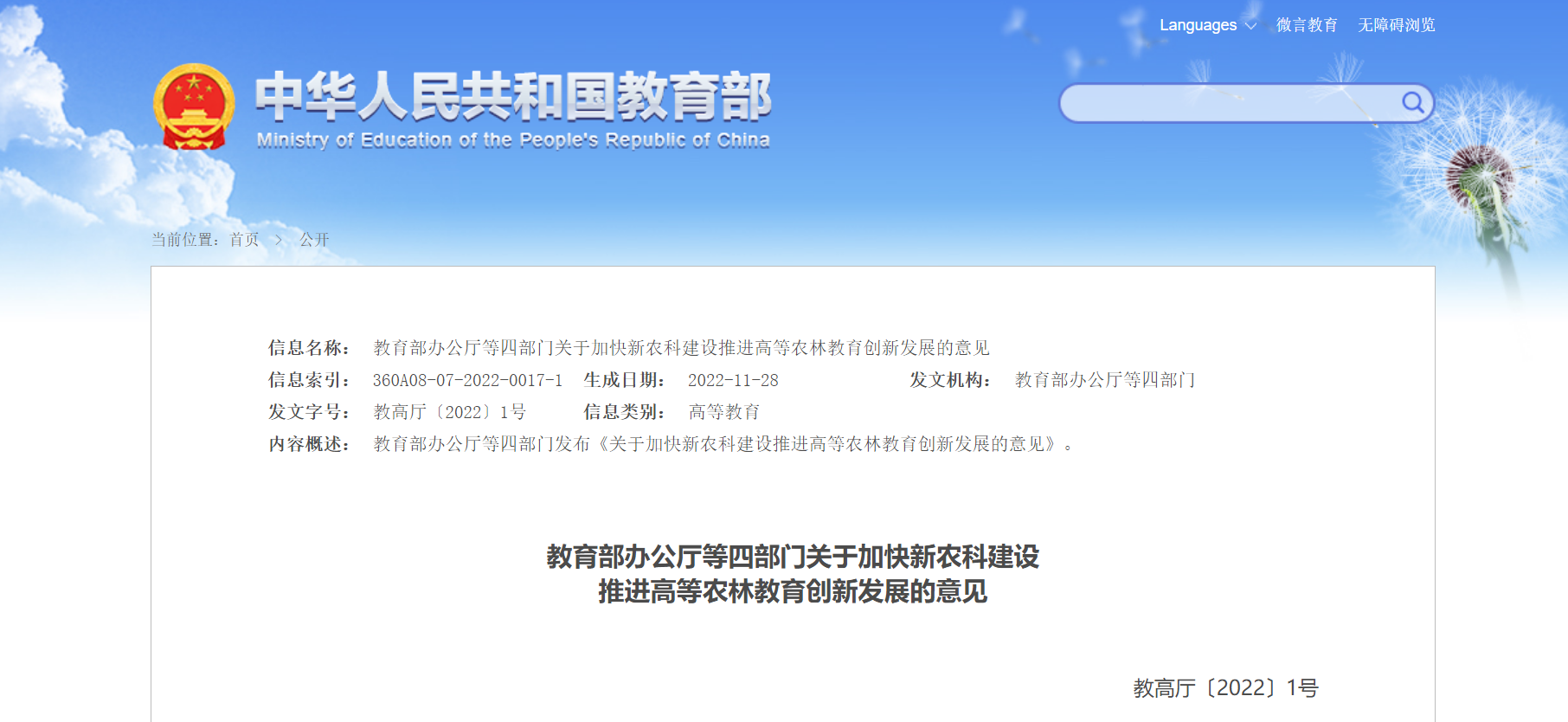 教育部辦公廳等四部門關(guān)于加快新農(nóng)科建設(shè)推進(jìn)高等農(nóng)林教育創(chuàng)新發(fā)展的意見(jiàn)