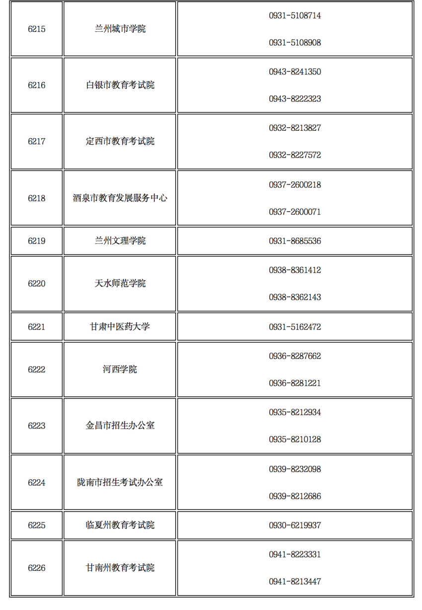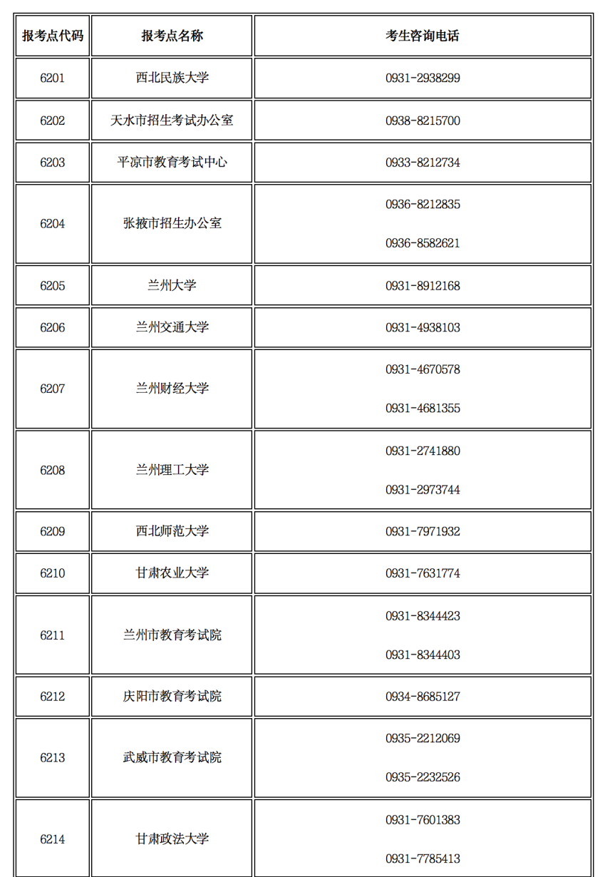 甘肅省2023年全國碩士研究生招生考試各報考點聯系電話