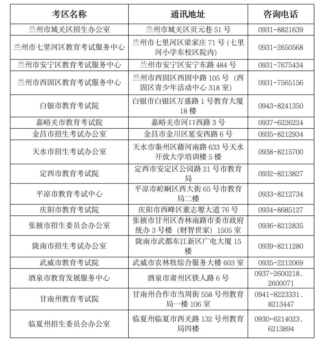 請(qǐng)考生提前做好備考工作,密切關(guān)注甘肅省教育考試院官方網(wǎng)站、官方微信公眾號(hào),及時(shí)了解相關(guān)考試信息,如有疑問(wèn)可咨詢報(bào)考所在地教育考試招生機(jī)構(gòu)(詳見(jiàn)附件)。